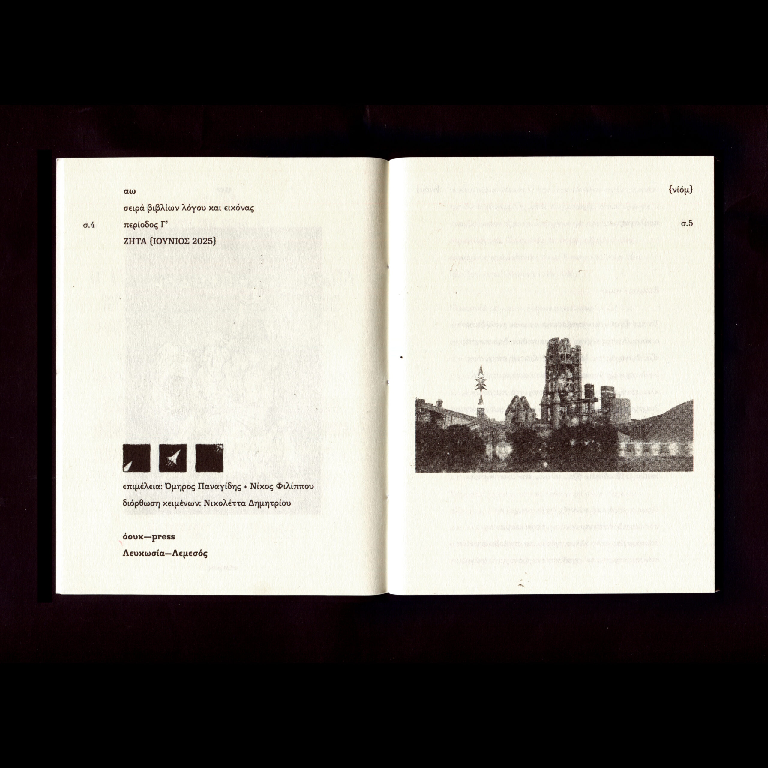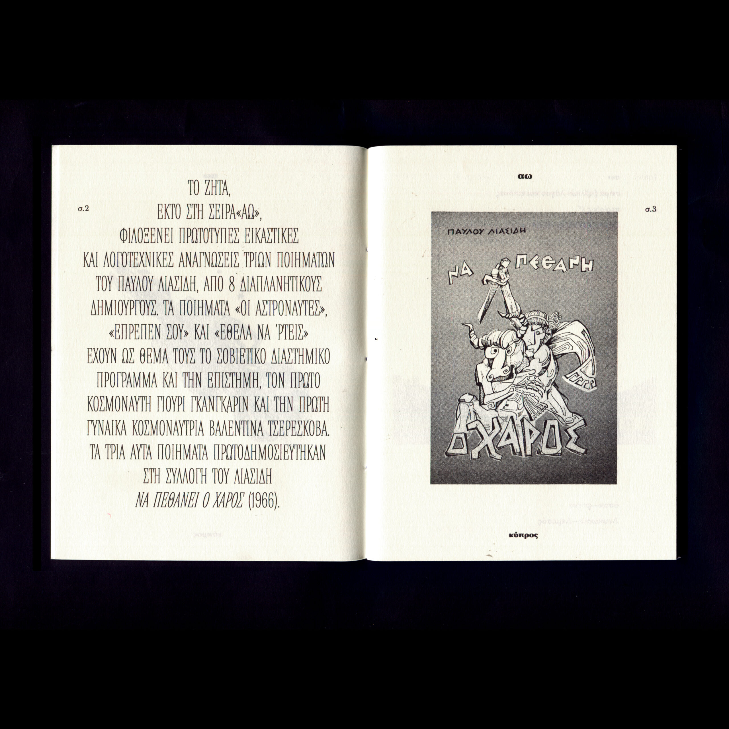 Το ΖΗΤΑ, έκτο στη σειρά «αω», φιλοξενεί πρωτότυπες εικαστικές και λογοτεχνικές αναγνώσεις τριών ποιημάτων του Παύλου Λιασίδη, από 8 διαπλανητικούς δημιουργούς. Τα ποιήματα «Οι Αστροναύτες», «Επρεπέν σου» και «’Εθελα να ’ρτεις» έχουν ως θέμα τους το σοβιετικό διαστημικό πρόγραμμα και την επιστήμη, τον πρώτο κοσμοναύτη Γιούρι Γκανγκάριν και την πρώτη γυναικά κοσμοναύτρια Βαλεντίνα Τσερέσκοβα. Τα τρία αυτά ποιήματα προδημοσιευτήκαν στη συλλογή του Λιασίδη Να πεθάνει ο Χάρος (1966).